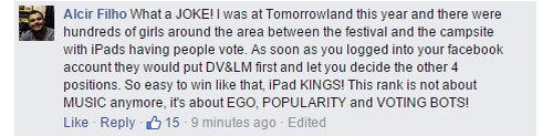 Nu sunt nici măcar supărată că niciunul dintre preferații mei (ATB, Armin van Buuren, Alesso, Axwell vs Ingrosso, Zedd) nu e pe primul loc, ci doar că ”gloria” le revine unor amatori care nu înțeleg despre ce e muzica electronică de fapt.