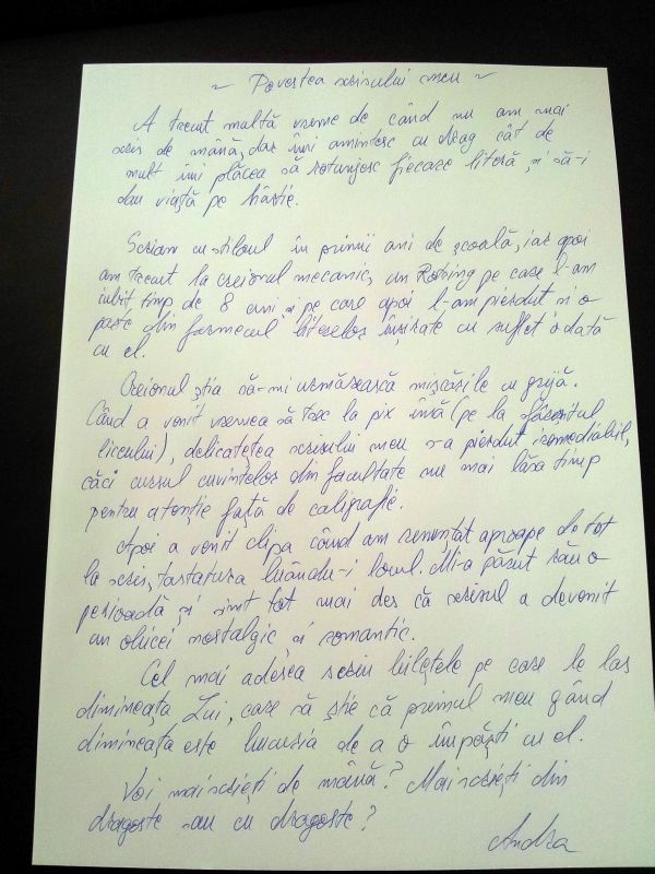 Hehe, toti am trecut prin faza stilou- creion mecanic Rotring (imi amintesc si acum de al meu, alb)-pix- scris oribil la cursuri in facultate. Eu mai scriu pe post-it- uri la serviciu, sau in meeting uri. Dar doar atat 🙁