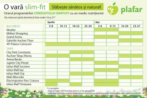Programul se numește ”O vară SLIM – FIT” și a început pe 5 aprilie, dar nu vă faceți griji, fiindcă va dura până pe 31 mai. Puteți să vă faceți programări de miercuri până duminică, între orele 16-21, la numărul de telefon verde 0800-07-03-07 sau la oricare dintre magazinele Plafar. Mai jos aveți și calendarul pentru această campanie: