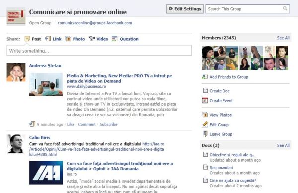 Cea mai mare problemă în crearea și gestionarea unui grup (și apoi a spamului inevitabil) este definirea obiectului de activitate, ca în orice alt proiect. E recomandat să stabilești o serie de obiective încă de la început și să faci astfel încât toți membrii să ia contact cu ele. Poți face asta prin publicarea pe wall, o dată pe lună, a documentului care conține acele obiective sau ori de câte ori este nevoie.